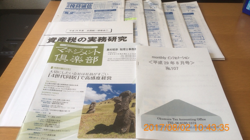 写真の当事務所の小冊子・事務所通信を顧問先に無料にて配布しています。会社経営に役立つ情報や税制改正等、盛り沢山な内容です。