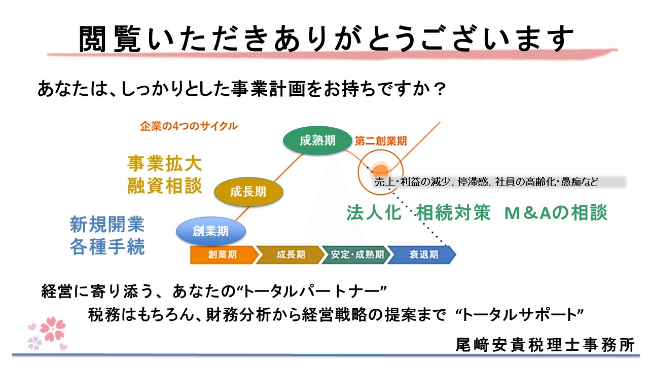 開業支援、経理支援、税務申告など様々な面からお客様の経営をサポートいたします。税理士2名で営業しております。ぜひお気軽にご相談下さい。