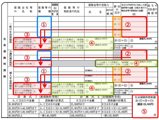 保険料控除証明書等に記載されている新旧区分を記載し、本年度中に支払った保険料を(a)に記載する。 |