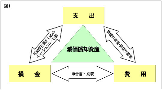 「支出」「費用」「損金」の関係は次(図1)のようになりますが、様々な目的達成のためにはその目的に応じて減価償却の性格を適切に捉えること及びそれらの関連づけが重要になります。
