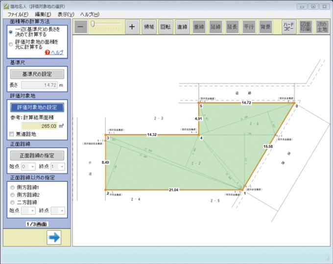 一例として、不整形地(正方形や長方形などの整形地ではない土地)は、評価額が下がる可能性が高くなります。当事務所では、土地評価専用のソフト(株式会社エッサム提供 蔭地名人)を活用し、信頼性の高い計算・資料作成を行っております。