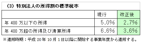 | 地方分権の推進によって地域間の税収入の不均衡解決の為、地方税財源を確保し安定した税収入を得られるために新たな地方税体系を構築する。この基本方針に沿って消費税を含む税体系の改革において地方消費税の充実と地方法人課税のあり方見直し地方税改革の実現に取り組む。消費税を含む税体系の改革が行われるまでの暫定措置として法人事業税の一部を分けて「地方法人特別税」と「「地方法人特別譲与税」を創設する。 | ||